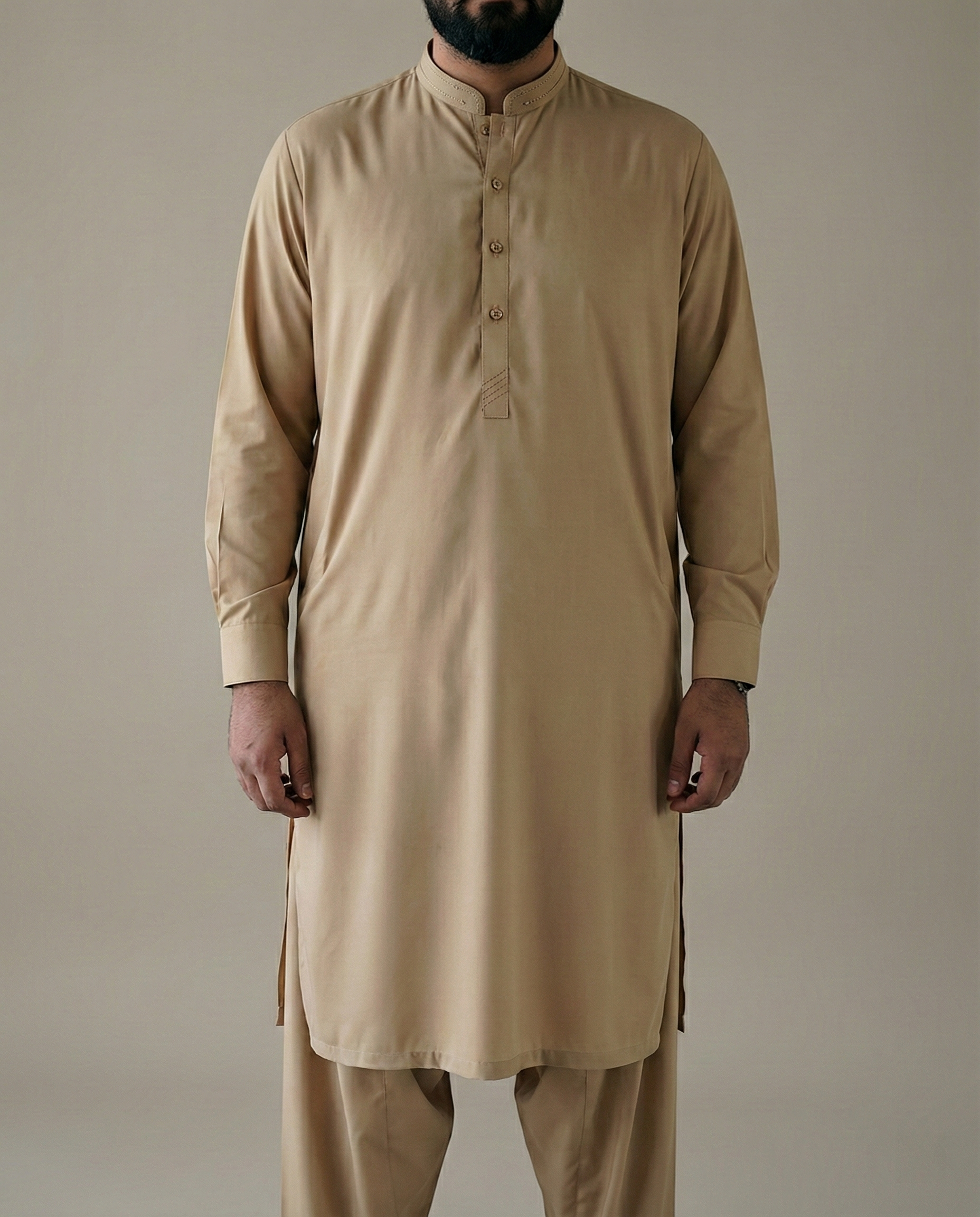Deze shalwar kameez heeft een zachte desert-beige kleur die een warme, rustige en luxe uitstraling geeft. Desert beige is een tijdloze, neutrale tint die verfijning uitstraalt en perfect past bij zowel lichte als donkere accessoires. Dankzij deze elegante en veelzijdige kleur is deze outfit geschikt voor zowel dagelijkse draagmomenten als formele gelegenheden, terwijl hij altijd een verzorgde en stijlvolle look behoudt.